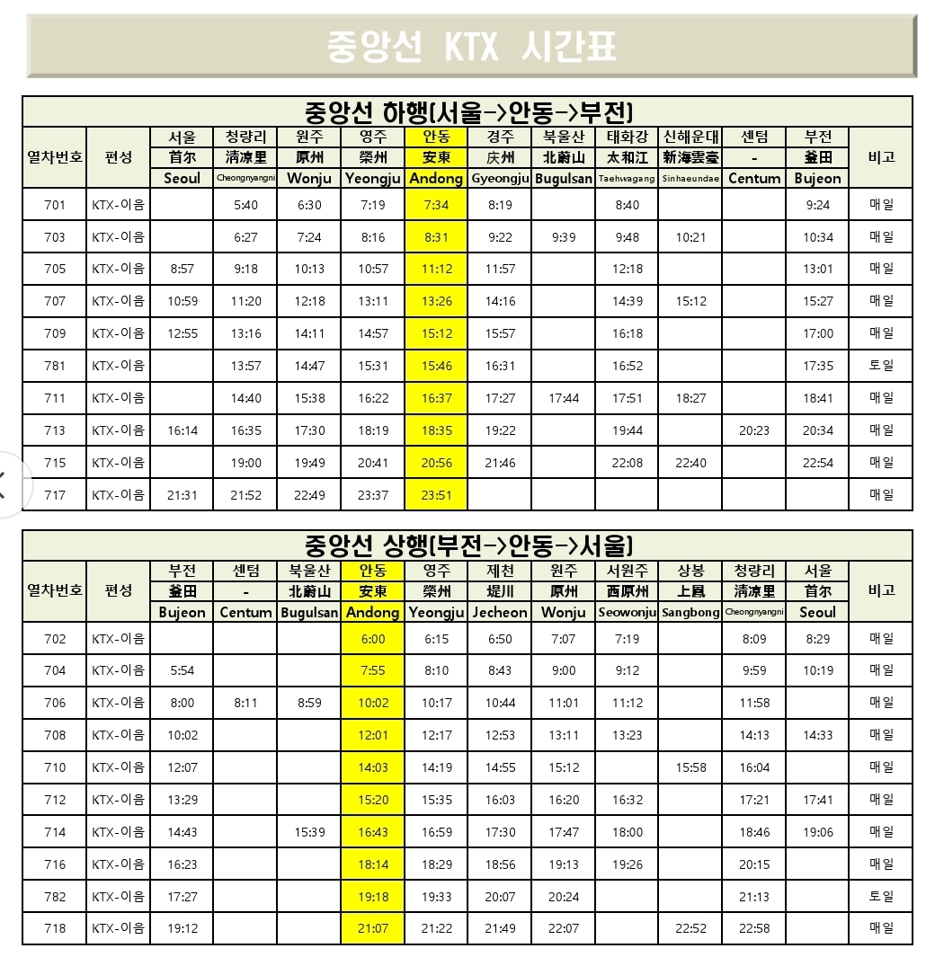 1)KTX이음706 : 부전-08:00(센텀,북울산-8:59,경주) 안동역 10:02 도착