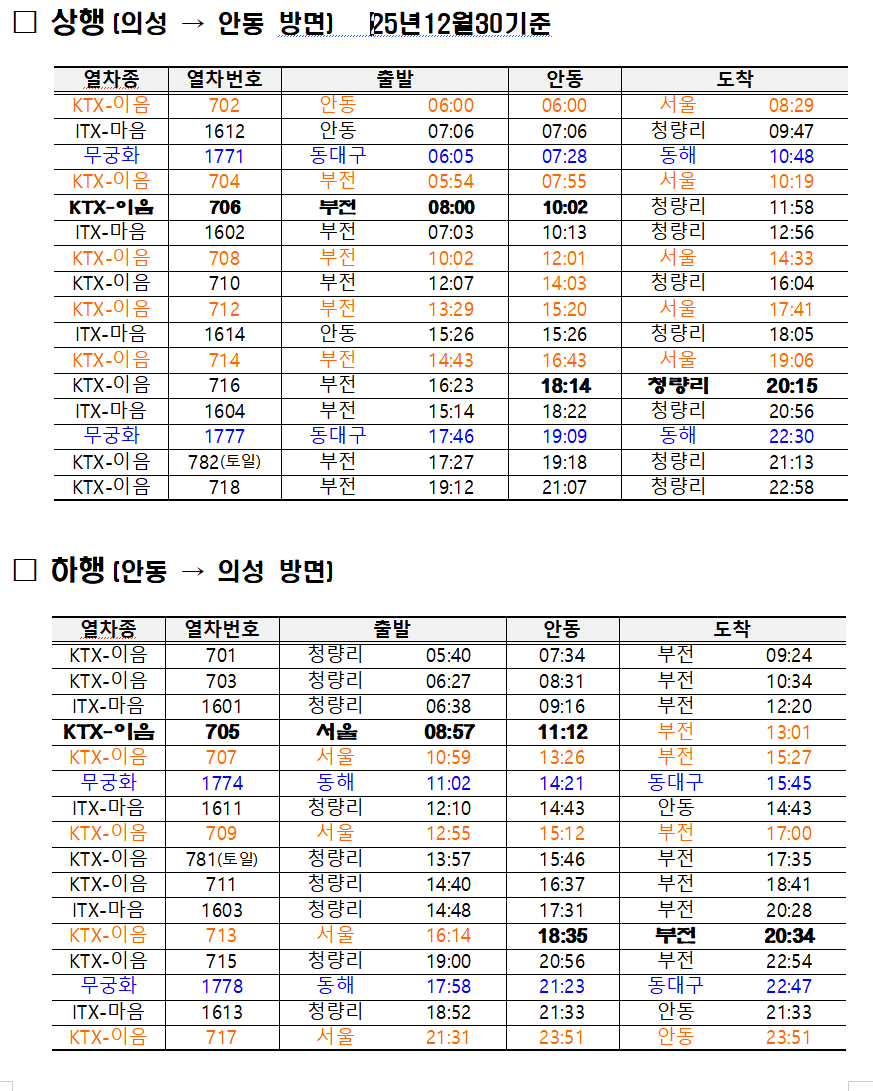 ▣ 25.12.30기준 KTX이음 안동도착, 출발시간 변경에 따른 안내