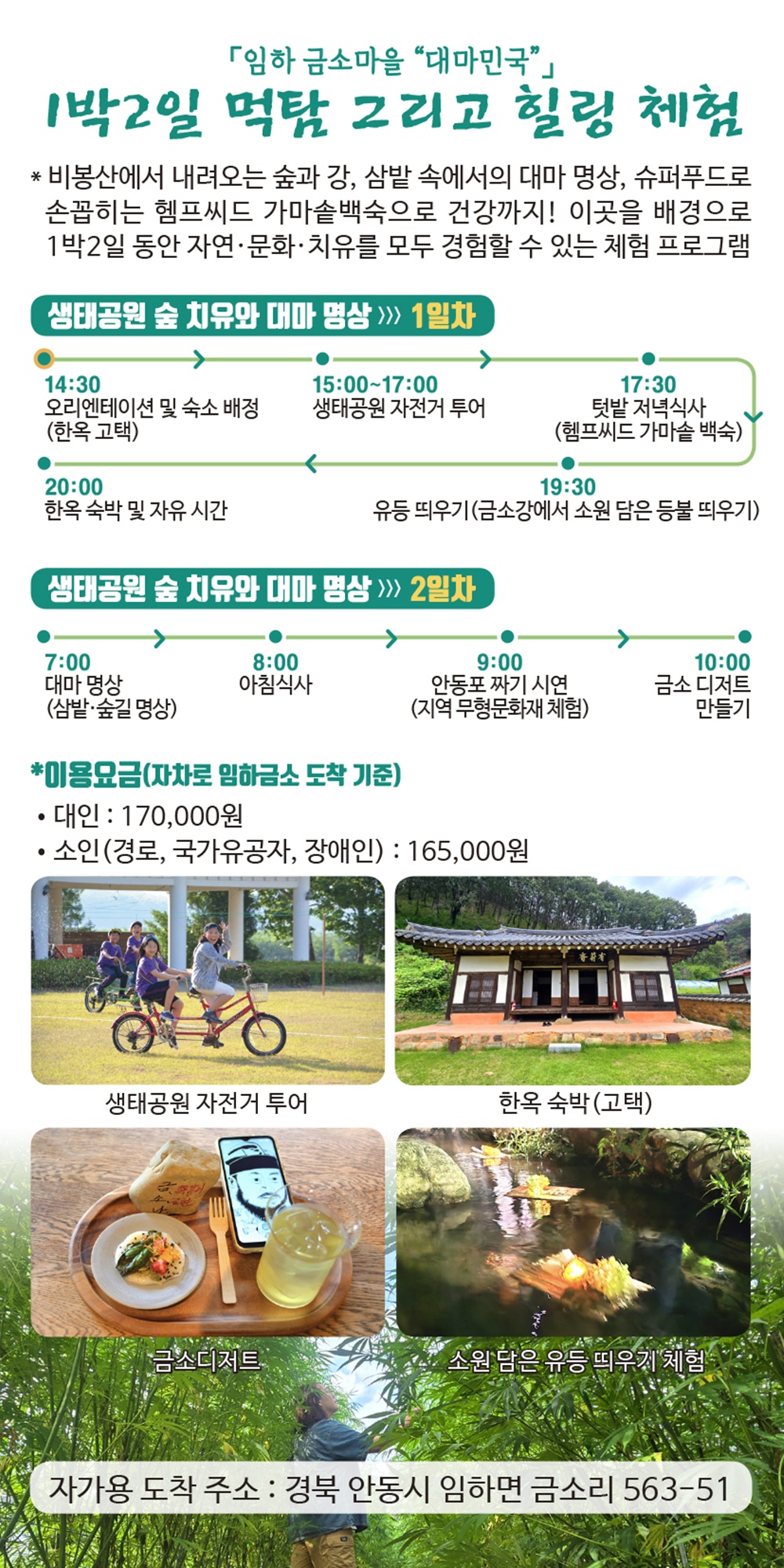 임하 금소리 생태공원과 금소 마을 일대는 비봉산에서 내려오는 숲과 강, 그리고 삼(대마)재배지로 이어집니다. 이곳을 배경으로 1박2일 동안 자연·문화·치유를 모두 경험할 수 있는 체험 프로그램을 구성했습니다. 핵심 테마는 “대마와 함께하는 힐링 여행”입니다.